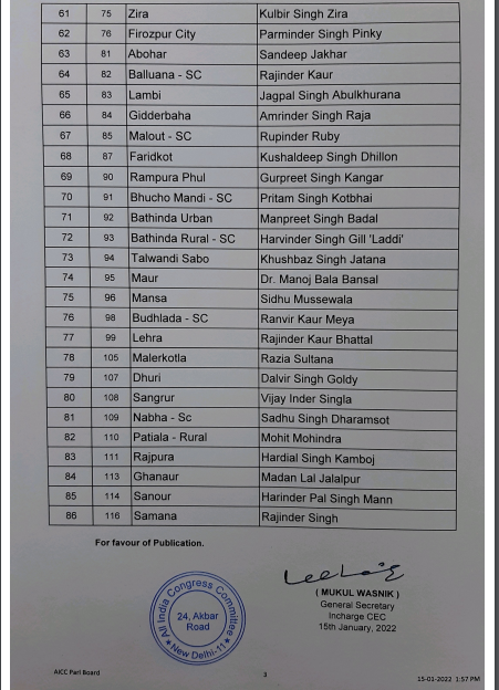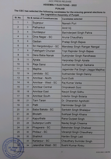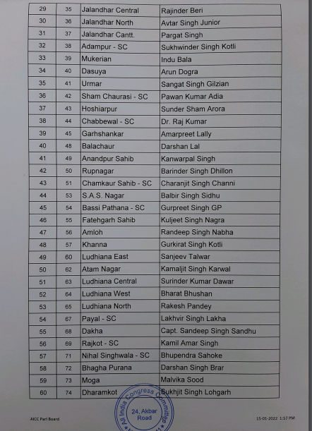 पंजाब विधानसभा चुनाव के लिए कांग्रेस पार्टी ने 86 सीटों पर उम्मीदवारों की पहली सूची जारी कर दी है। इस बार सूबे के मुख्यमंत्री चरणजीत सिंह चन्नी चमकौर साहिब एससी से चुनाव लड़ेंगे, पंजाब कांग्रेस अध्यक्ष नवजोत सिंह सिद्धू अमृतसर पूर्व से चुनाव लड़ेंगे। वहीं उपमुख्यमंत्री सुखजिंदर सिंह रंधावा अपनी वर्तमान सीट डेरा बाबा नायक से चुनावी मैदान में उतरेंगे।
