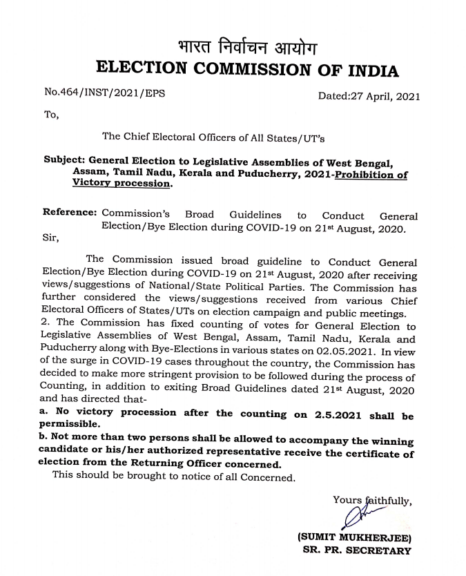 चुनाव आयोग के मुताबिक, 2 मई को मतगणना के बाद कोई भी विजय जुलूस की अनुमति नहीं होगी। 2 से अधिक व्यक्तियों को जीतने वाले उम्मीदवार के साथ जाने की अनुमति नहीं होगी। आयोग ने कहा कि उसके अधिकृत प्रतिनिधि संबंधित निर्वाचन अधिकारी से चुनाव का प्रमाण पत्र प्राप्त करेंगे।
