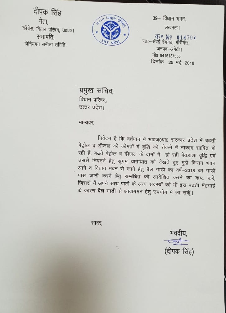 कांग्रेस के विधान परिषद सदस्य (एमएलसी) दीपक सिंह ने देशभर में लगातार बढ़ रहे पेट्रोल-डीजल की कीमतों के विरोध में एक अनोखा तरीका निकाला है। उन्होंने लखनऊ में विधान परिषद के प्रमुख सचिव को पत्र लिखकर बैलगाड़ी के लिए वाहन पास जारी करने की मांग की।