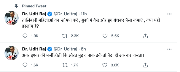 इससे पहले कांग्रेस नेता उदित राज ने तालिबानी करतूतों पर सवाल उठाते हुए और इस्लाम को लेकर कहा था, "तालिबानी महिलाओं का शोषण करें , बुर्का में कैद और ड्रग बेचकर पैसा कमाएं , क्या यही इस्लाम है?"