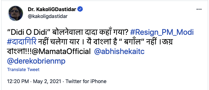 अब बीजेपी के नेताओं और प्रधानमंत्री मोदी पर टीएमसी नेता ने तंज कसते हुए कहा है कि दीदी ओ दीदी बोलने वाला दादा कहां गया।टीएमसी सांसद काकोली दास्तीदार ने ट्वीट करते हुए लिखा, “Didi O Didi” बोलनेवाला दादा कहाँ गया? #Resign_PM_Modi#दादागिरि नहीं चलेगा यार । यै বাংলা है “ बगाँल” नहीं ।জয় বাংলা!!!@MamataOfficial @abhishekaitc @derekobrienmp"