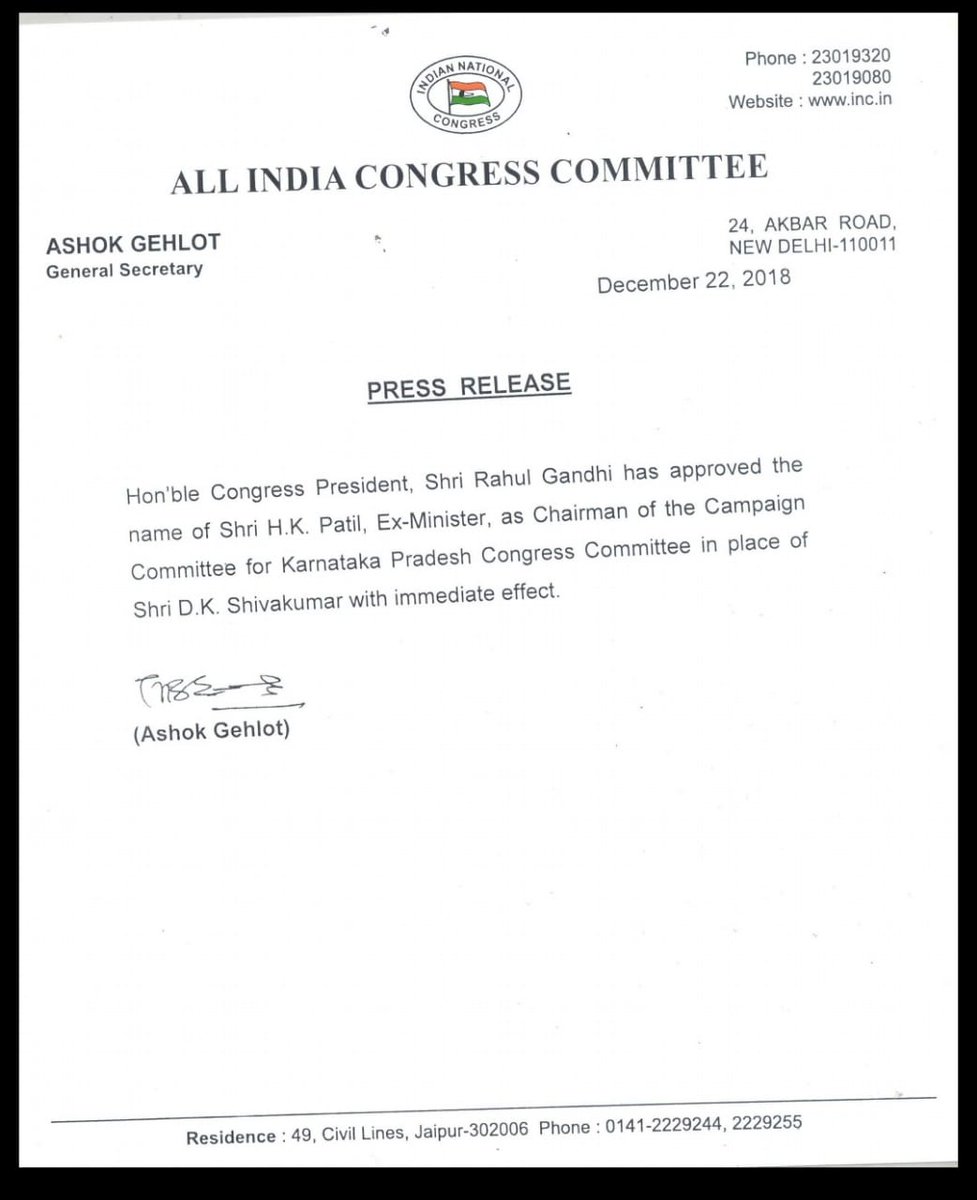 अखिल भारतीय कांग्रेस समिति के बयान के अनुसार, कांग्रेस अध्यक्ष राहुल गांधी ने पूर्व मंत्री एच.के. पाटिल को तत्काल प्रभाव से डी.के. शिवकुमार के स्थान पर कर्नाटक प्रदेश कांग्रेस समिति के प्रचार समिति का अध्यक्ष नियुक्त किया है। कर्नाटक प्रचार समिति का अध्यक्ष नियुक्त किये जाने का बाद एच. के. पाटिल ने ट्वीट कर बाहुल को धन्यवाद किया।