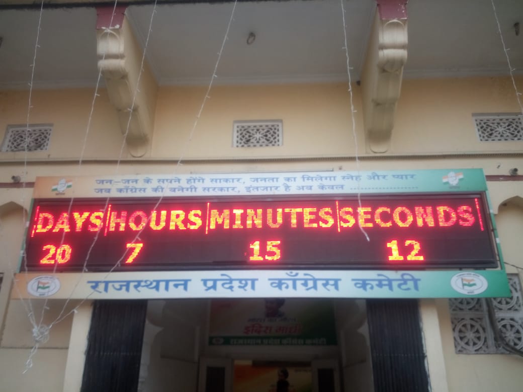दरअसल, पार्टी ने अपने मुख्यालय के गेट के ऊपर एक डिजीटल डिवाइस लगा रखा है, जिसमें पार्टी ने 11 दिसंबर को होने वाली मतगणना को लेकर काउंटडाउन शुरू कर दिया है। गुरुवार रात लगाए गए इस डिजीटल डिवाइस में दिन (20), घंटे (7), मिनट (15) और सैकेंड्स (10) का जिक्र है। इस डिवाइस के ऊपर दो लाइनें लिखी हुईं हैं, जिसमें कहा गया है- जन-जन के सपने होंगे साकार, जनता का मिलेगा स्नेह और प्यार, जब कांग्रेस की बनेगी सरकार, इंतजार है अब केवल......। माना जा रहा है कि इस डिवाइस के माध्यम से कांग्रेस ये संदेश देने की कोशिश कर रही है कि भाजपा की हार में मात्र इतना (डिवाइस में दिए गए आंकड़ा) समय बचा है।