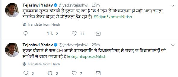 तेजस्वी ने कहा कि मुख्यमंत्री सृजन घोटाले से इतना डर गए है कि 4 दिन से विधानसभा ही नही आए। जनता लालटेन लेकर बिहार मे नैतिकता ढूंढ रही है। साथ ही, उन्होंने यह भी कहा कि सृजन घोटाले में फंसे CM अपने उपसभापति से विधानपरिषद में राजद के विधानपार्षदों को मार्शलों से बाहर करवा रहे है।