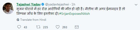 तेजस्वी ने कहा कि जब तक नीतीश कुमार और सुशील मोदी इस्तीफा नहीं दे देते, तब तक विपक्षी सृजन महाघोटाले के मुद्दे को उठाना बंद नहीं करेगा।