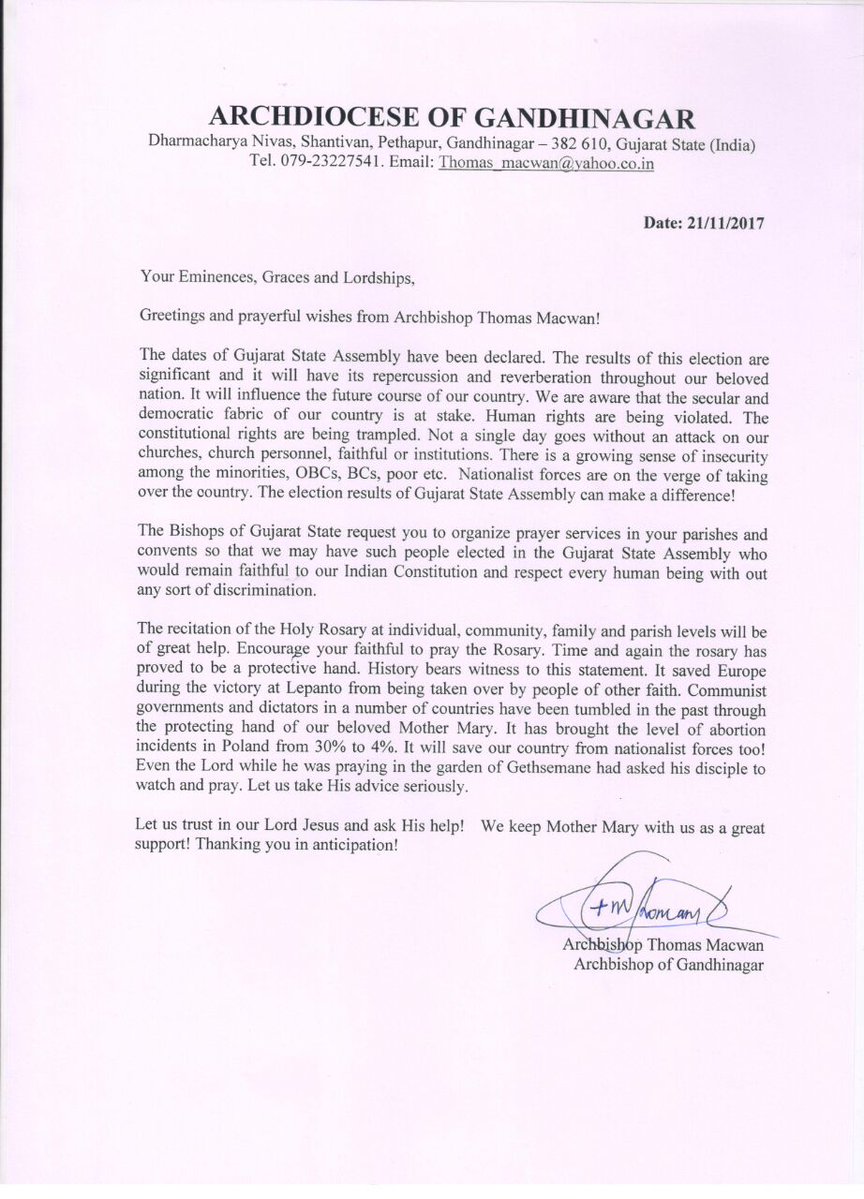 पत्र में उन्होंने आगे लिखा है, "गुजरात राज्य के बिशप्स ने आप से अनुरोध किया है कि आप अपने परिसरों और घरों में ऐसी प्रार्थनाएं करें ताकि गुजरात विधानसभा चुनाव में वो लोग जीतें जो हमारे संविधान के प्रति वफादार रहे और किसी भी भेदभाव के बिना हर इंसान का सम्मान करें। प्रभु यीशु ने सूली पर चढ़ाए जाने के समय भी प्रार्थना करते समय अपने शिष्य से प्रार्थना करने को कहा था। तो आइए हम उनकी सलाह को गंभीरता से लेते हैं। आइए हम अपने प्रभु यीशु पर विश्वास करें और उनकी सहायता मांगें!"