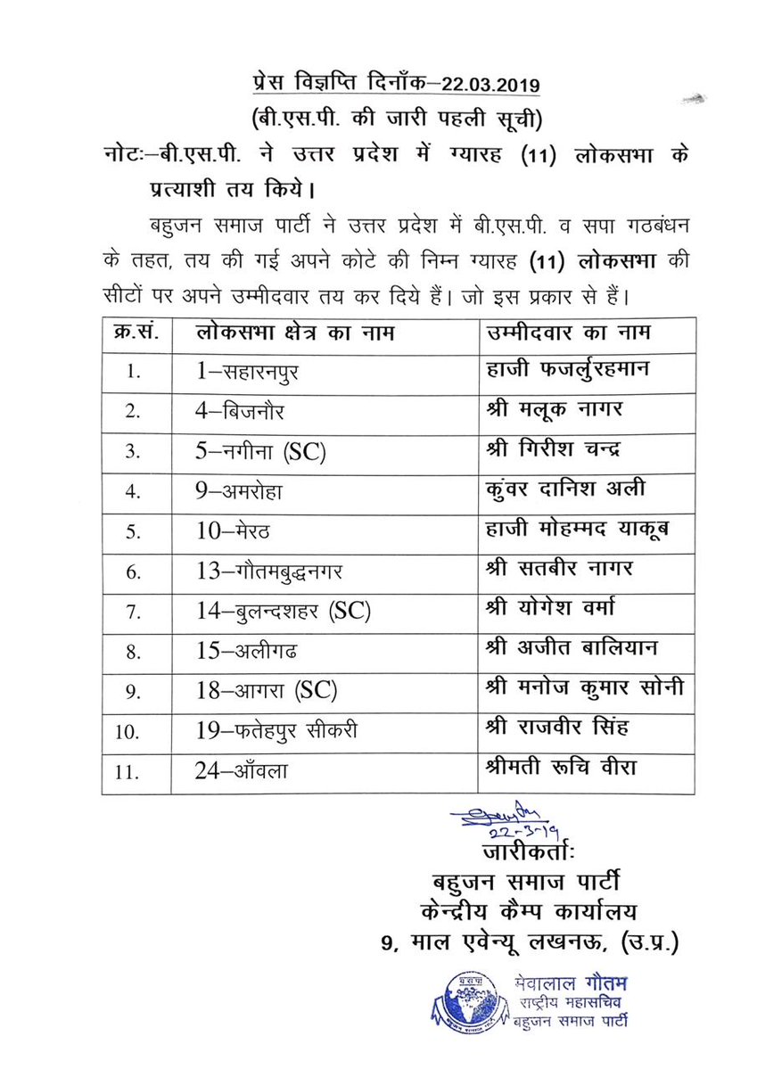 इससे पहले 22 मार्च को बसपा ने उत्तर प्रदेश के अपने प्रत्याशियों की पहली लिस्ट जारी की थी जिसमें 11 लोकसभा सीटों के प्रत्याशियों के नाम का ऐलान किया गया था। कुल मिलाकर पार्टी के अब 17 उम्मीदवार घोषित हो चुके हैं और उत्तर प्रदेश में हुए महागठबंधन के तहत BSP कुल 38 लोकसभा सीटों पर अपने प्रत्याशी उतारेगी। बता दें कि बसपा सुप्रीमो मायावती ने इस बार खुद लोकसभा चुनाव नहीं लड़ने का फैसला किया है।