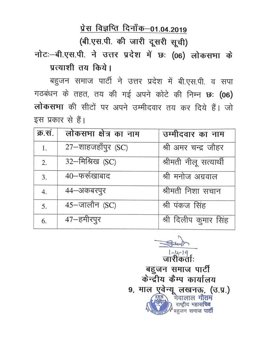 सोमवार को पार्टी ने यूपी के लिए अपने उम्मीदवारों की दूसरी लिस्ट जारी की थी। पार्टी ने लिस्ट में उत्तर प्रदेश की 6 लोकसभा सीटों के लिए प्रत्याशी घोषित किए हैं। बसपा ने शाहजहांपुर, मिश्रिख, फर्रुखाबाद, अकबरपुर, जालौन और उत्तर प्रदेश की हमीरपुर लोकसभा सीट के लिए प्रत्याशी घोषित किए हैं।