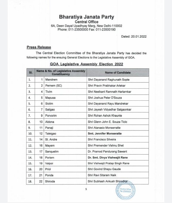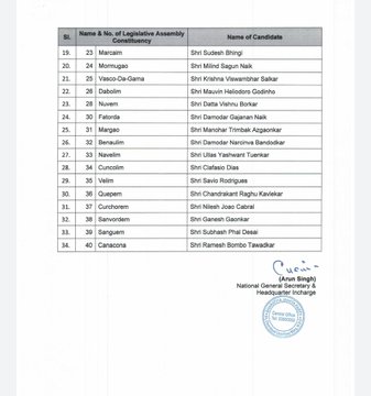 गोवा में हाल ही में विधानसभा चुनाव होने को हैं और बीजेपी ने इसके मद्देनजर अपने उम्मीदवारों के नाम घोषित कर दिए हैं। भाजपा ने विधानसभा चुनाव के लिए 34 उम्मीदवारों के नाम की घोषणा की है। मुख्यमंत्री प्रमोद सावंत सांकेलिम और उप मुख्यमंत्री मनोहर अजगांवकर मडगांव से चुनाव लड़ेंगे।