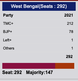 पश्चिम बंगाल में अब की बार किसकी सरकार बनेगी इसकी तस्वीर अब साफ हो गई है। ताजा रुझानों में सत्ताधारी टीएमसी पिछले चुनावों से भी अच्छा प्रदर्शन करती दिख रही है। शाम 5 बजे तक के रूझानों के अनुसार टीएमसी 212 सीटों पर आगे हैं। जबकि पिछली बार उसे 211 सीटें मिली थी।