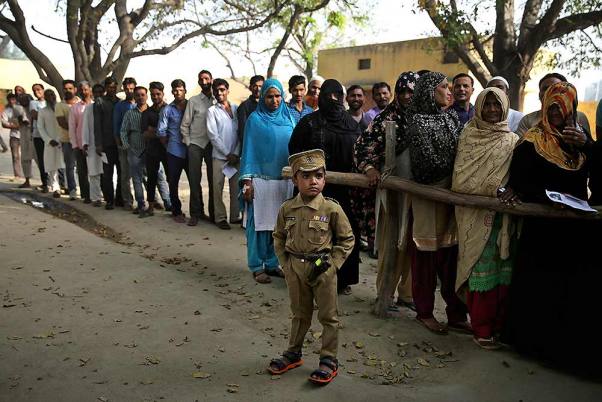 - उत्तर प्रदेश के मेरठ के पास सावल गांव में मतदान केंद्र पर वोट डालने आए लोगों के बीच पुलिस की वर्दी में बच्चा।