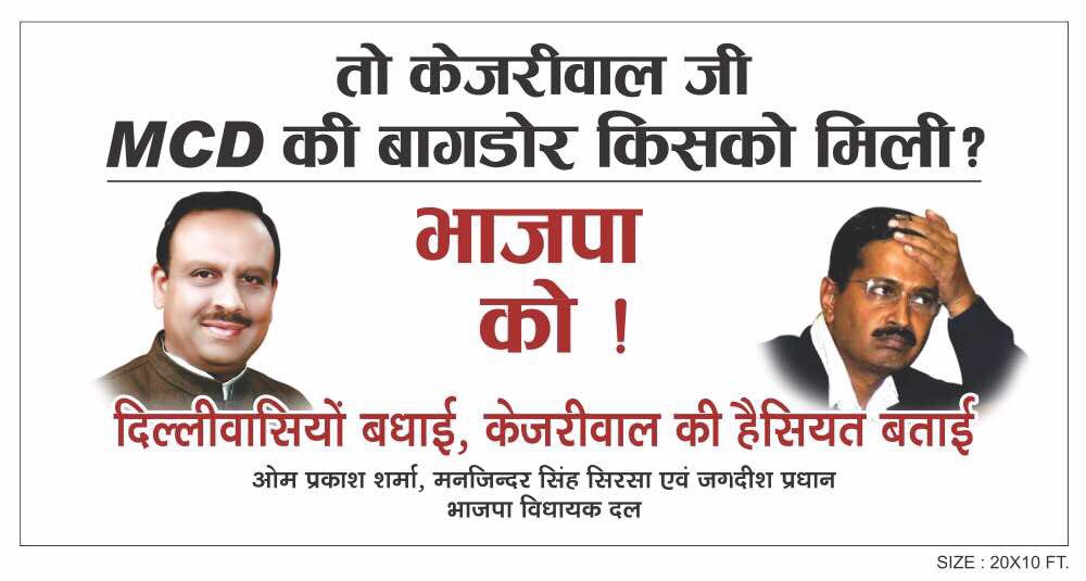 दिल्ली में मिली शानदार जीत के बाद भाजपा अध्यक्ष अमित शाह ने कोलकाता में प्रेस कांफ्रेस कर इसे प्रधानमंत्री नरेंद्र मोदी के तीन साल के शासनकाल पर जनता की मुहर बताया। शाह ने कहा कि दिल्ली की जनता ने स्पष्ट संदेश दिया है कि नकारात्मक और बहानेबाजी की राजनीति नहीं चलेगी। दिल्ली विधानसभा में प्रतिपक्ष के नेता विजेंद्र गुप्ता ने भी केजरीवाल की खिंचाई करते हुए उन्हीं की तर्ज पर पूछा है कि एमसीडी की बागडाेेर किसको मिली है। गौरतलब है कि चुनाव प्रचार के दौरान आम आदमी पार्टी ने एमसीडी की बागडोर विजेेंद्र गुप्ता के हाथ में जाने के आराेप लगाते हुए पूरे होर्डिंग लगवा दिए थे।