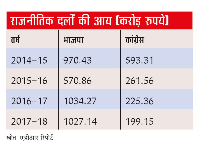 अगर आंकड़ों को देखा जाए तो यह बात साफ हो जाती है कि सत्ताधारी दल को चंदा देने में कॉरपोरेट से लेकर दूसरे लोग अपनी सहूलियत समझते हैं। इसे पिछले पांच साल में भारतीय जनता पार्टी और कांग्रेस की आय से समझा जा सकता है। साल 2014-15 में जहां भाजपा की आय 970.43 करोड़ रुपये थी और कांग्रेस की आय 593.31 करोड़ रुपये थी। यह समीकरण 2017-18 आते-आते पूरी तरह से बदल गया है। साल 2017-18 की भाजपा की आय जहां 1027.34 करोड़ रुपये पहुंच गई, वहीं कांग्रेस की आय घटकर 199.15 करोड़ रुपये रह गई।
