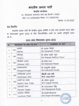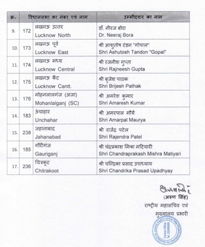 लखनऊ कैंट से बृजेश पाठक, लखनऊ पश्चिम से अंजनी श्रीवास्तव, मलिहाबाद से जया देवी, सीटिंग विधायक केंद्रीय मंत्री कौशल किशोर की पत्नी को दोबारा टिकट दिया गया है। लखनऊ उत्तर नीरज बोरा और लखनऊ मध्य से रजनीश गुप्ता को उम्मीदवार बनाया गया है। लखनऊ पूर्व से आशुतोष टंडन को उतारा गया है। यहां से अपर्णा यादव और रीता बहुगुणा के बेटे को टिकट की उम्मीद जताई जा रही थी।