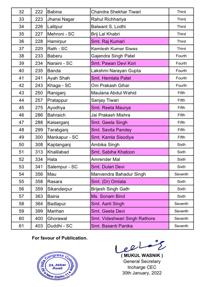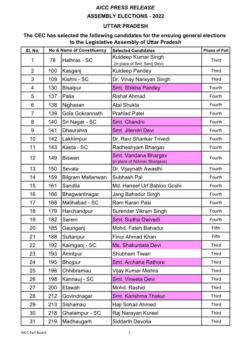 लिस्ट के मुताबिक लखीमपुर से रवि शंकर त्रिवेदी, गैरीगंज से फतेह बहादुर, सुल्तानपुर से फिरोज़ अहमद खान, कन्नौज से विनीता देवी, गोविंद नगर से करिश्मा ठाकुर, हमीरपुर से राज कुमारी, अयोध्या से रीता मौर्य, हाथरस से कुलदीप कुमार सिंह, बीसलपुर को शिखा पांडेय, श्री नगर से चांदनी, धौराहरा से जितेंद्री देवी, बिसवान से वंदना भार्गव, सारेनी से सुधा द्विवेदी, कैमगंज से शकुंलता देवी, भोजपुर से अर्चना राठौड़, को टिकट दिया है।