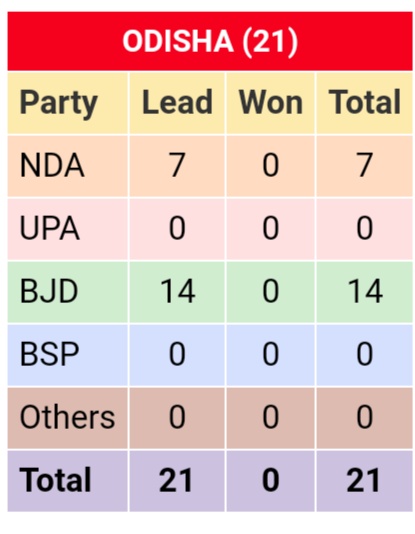 4 बजे- ओडिशा में एनडीए 6 सीटों पर, बीजेडी 15 सीटों पर आगे