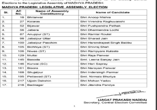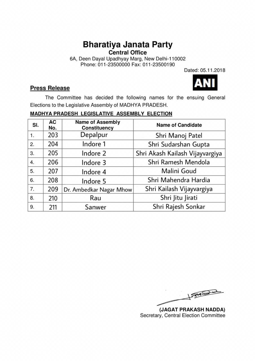 मध्य प्रदेश विधानसभा चुनाव के लिए भाजपा ने सोमवार को नौ उम्मीदवारों की तीसरी लिस्ट भी जारी कर दी है। इससे कुछ देर पहले 17 उम्मीदवारों की दूसरी लिस्ट सूची जारी की गई थी।