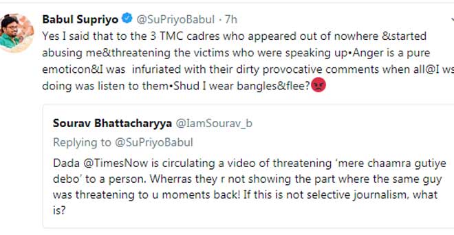 केंद्रीय मंत्री और भाजपा के सांसद बाबुल सुप्रियो ने स्वीकार किया है कि उन्होंने कुछ लोगों को चमड़ी उधेड़ने की धमकी दी थी। आज किए गए ट्वीट में उन्होंने कहा कि हां, मैंने ऐसा कहा। वहां पर तृणमूल कांग्रेस के तीन कार्यकर्ता मौजूद थे जो हंगामा करने के साथ मुझे गालियां दे रहे थे। वे मुझसे बात करने वाले लोगों को धमकी दे रहे थे। मेरा गुस्सा पूरी तरह भावनात्मक था और मैं उनकी भड़काऊ टिप्पणियों से व्यथित हो गया। क्या मुझे चुड़ियां पहन लेनी चाहिए और भाग जाना चाहिए था।