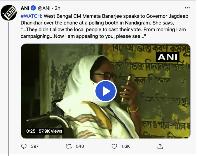 ममता बनर्जी ने पोलिंग बूथ से राज्यपाल जगदीश धनखड़ को कॉल करते हुए कहा, “वे (भाजपा कार्यकर्ता) लोग यहां के स्थानीय लोगों को वोट नहीं करने दे रहे हैं। सुबह से ही मैं इसके बारे में बता रही हूं, अब मैं अपील कर रही हूं कि कृपया स्थिति को देखें।“ वहीं, धनखड़ को फोन करने से पहले ममता बनर्जी ने कहा कि “जो लोग नारे लगा रहे हैं वो बाहरी लोग हैं। ये यूपी-बिहार से आए हैं।“