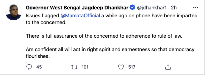 राज्यपाल जगदीप धनखड़ ने मामले पर संज्ञान लेते हुए कार्रवाई के आदेश दिए हैं। गर्वनर ने ट्वीट कर ममता बनर्जी को आश्वासन दिया। उन्होंने कहा, “ममता बनर्जी ने चिंता व्यक्त की है। मैंने उन्हें सही कदम उठाए जाने का भरोसा दिया है। उम्मीद है कि सही भावना से काम किया जाएगा ताकि लोकतंत्र आगे बढ़े।“ वहीं, चुनाव उपायुक्त सुदीप जैन ने पश्चिम बंगाल के मुख्य निर्वाचन अधिकारी से नंदीग्राम और केशपुर की जमीनी स्थिति पर रिपोर्ट मांगी है।
