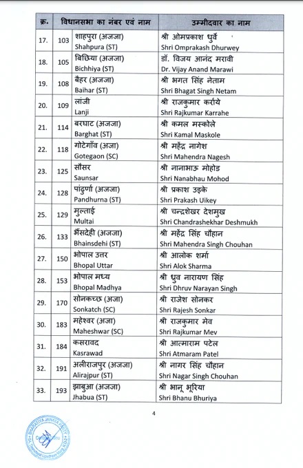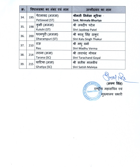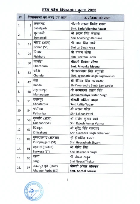 मध्य प्रदेश में बीजेपी ने सबलगढ़ से सरला विजेंद्र रावत, चाचौड़ा से प्रियंका मीना, छतरपुर से ललिता यादव, जबलपुर पूर्व (एससी) से आंचल सोनकर, पेटलावद से निर्मला भूरिया, झाबुआ (एसटी) से भानु भूरिया, भोपाल उत्तर से आलोक शर्मा और भोपाल मध्य से ध्रुव नारायण सिंह को मैदान में उतारा है।