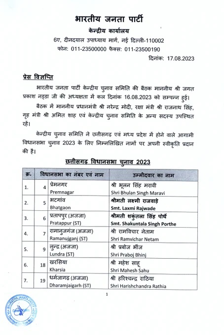 भाजपा ने आगामी विधानसभा चुनावों के लिए गुरुवार को छत्तीसगढ़ के लिए 21 और मध्य प्रदेश के लिए 39 उम्मीदवारों की घोषणा की, जिनमें दोनों राज्यों में पांच-पांच महिलाएं भी शामिल हैं, जिनकी घोषणा अभी बाकी है। पार्टी ने अपने दुर्ग सांसद विजय बघेल को पाटन से मैदान में उतारा है, जिसका प्रतिनिधित्व वर्तमान में छत्तीसगढ़ के मुख्यमंत्री और कांग्रेस नेता भूपेश बघेल कर रहे हैं।
