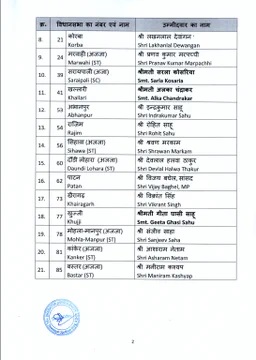 छत्तीसगढ़ में भाजपा ने पाटन से बघेल, प्रेमनगर से भूलन सिंह मरावी, भटगांव से लक्ष्मी राजवाड़े, प्रतापपुर (एसटी) से शकुंतला सिंह पोर्थे, सरायपाली (एससी) से सरला कोसरिया, खल्लारी से अलका चंद्राकर, खुज्जी से गीता घासी साहू और बस्तर (एसटी) से मनीराम कश्यप को मैदान में उतारा है।