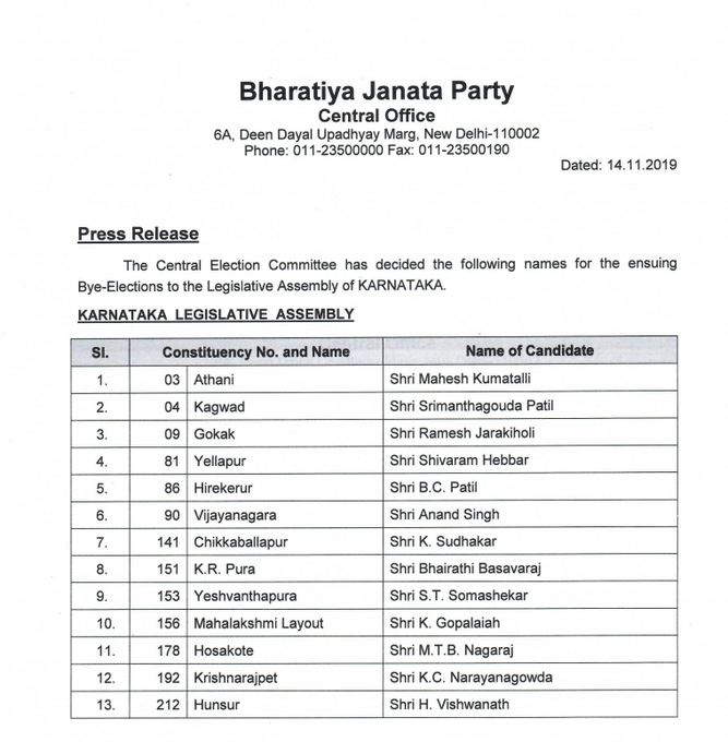 पहली लिस्ट में जिन प्रमुख नामों को जगह मिली है उसमें के सुधाकर, बीसी पाटिल, शिवराम हेब्बर, आनंद सिंह, एसटी सोमशेखर सहित कई नेता शामिल हैं। ये सभी उम्मीदवार कांग्रेस और जेडीएस के बागी विधायक थे। आज ही कर्नाटक के कांग्रेस और जेडीएस के 16 बागी विधायक भाजपा में शामिल हुए थे। कर्नाटक विधानसभा उपचुनाव के लिए 5 दिसंबर को मतदान होना है और 9 दिसंबर को नतीजे आएंगे।