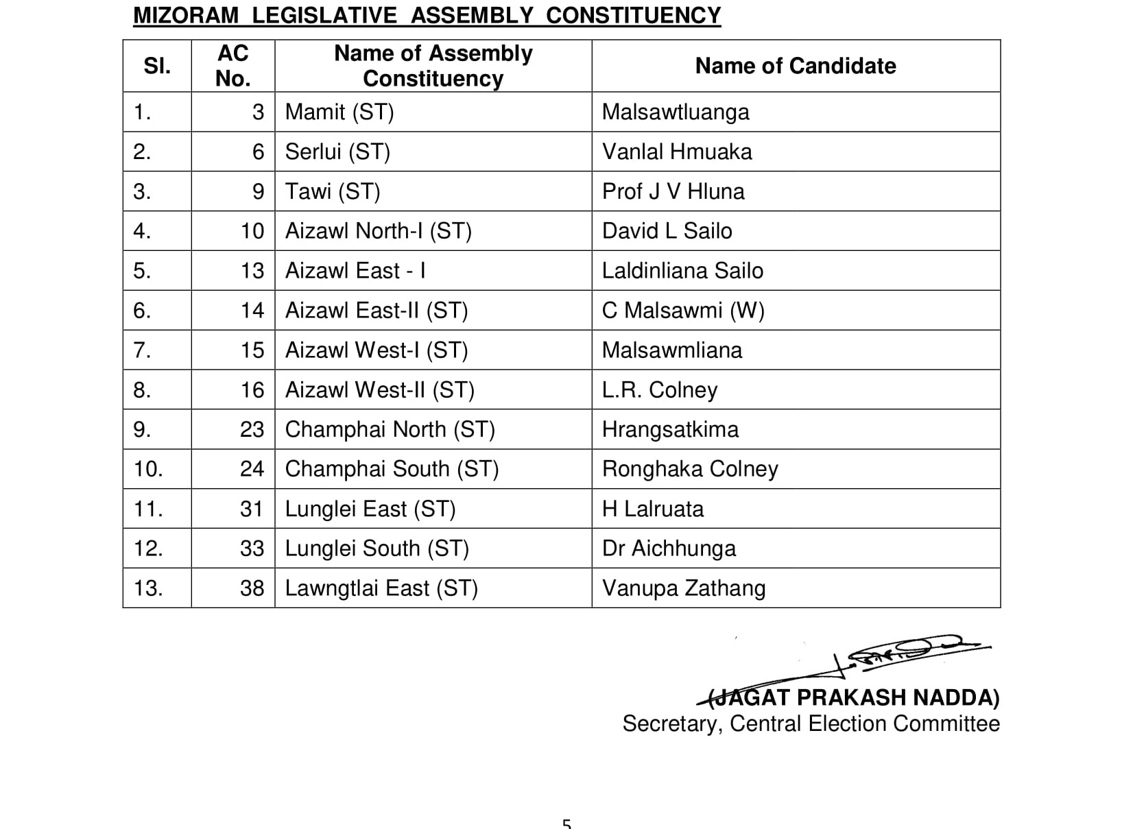 मिजोरम: 13 उम्मीदवारों की सूची जारी