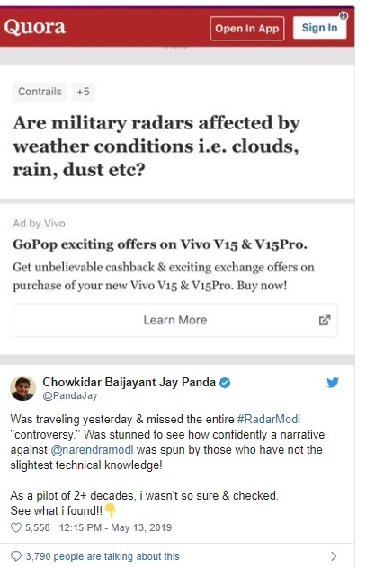 उन्होंने कहा कि वह यह देखकर भौंचक्के रह गए कि लोग पीएम की टिप्पणी के खिलाफ इतने भरोसे के साथ बयान दे रहे हैं। उन्होंने ट्विटर पर लिखा कि चूंकि वह रविवार को यात्रा कर रहे थे, इसलिए रडार मोदी विवाद को देख नहीं पाए। लेकिन मोदी के बचाव में पांडा के स्क्रीनशॉट देखकर अवाक रह गए जो पांडा ने अपने ट्वीट के साथ पोस्ट किया था। इस स्क्रीनशॉट में प्रश्न-उत्तर वेबसाइट कोरा पर किसी रडार सिस्टम इंटीग्रेटर एंडी मीकैम की टिप्पणी है।