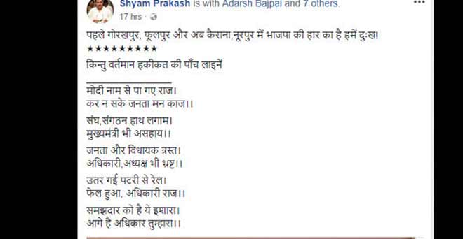 उत्तर प्रदेश में उपचुनावों में भाजपा की लगातार हो रही हार पर हरदोई से भाजपा विधायक श्यामप्रकाश ने संगठन और सरकार पर निशाना साधा है। उन्होंने फेसबुक पर ‘पहले गोरखपुर, फूलपुर और अब कैराना,नूरपुर में भाजपा की हार का है हमें दुःख! ’ शीर्षक से कविता पोस्ट कर अपने मन की पीड़ा का इजहार किया है।