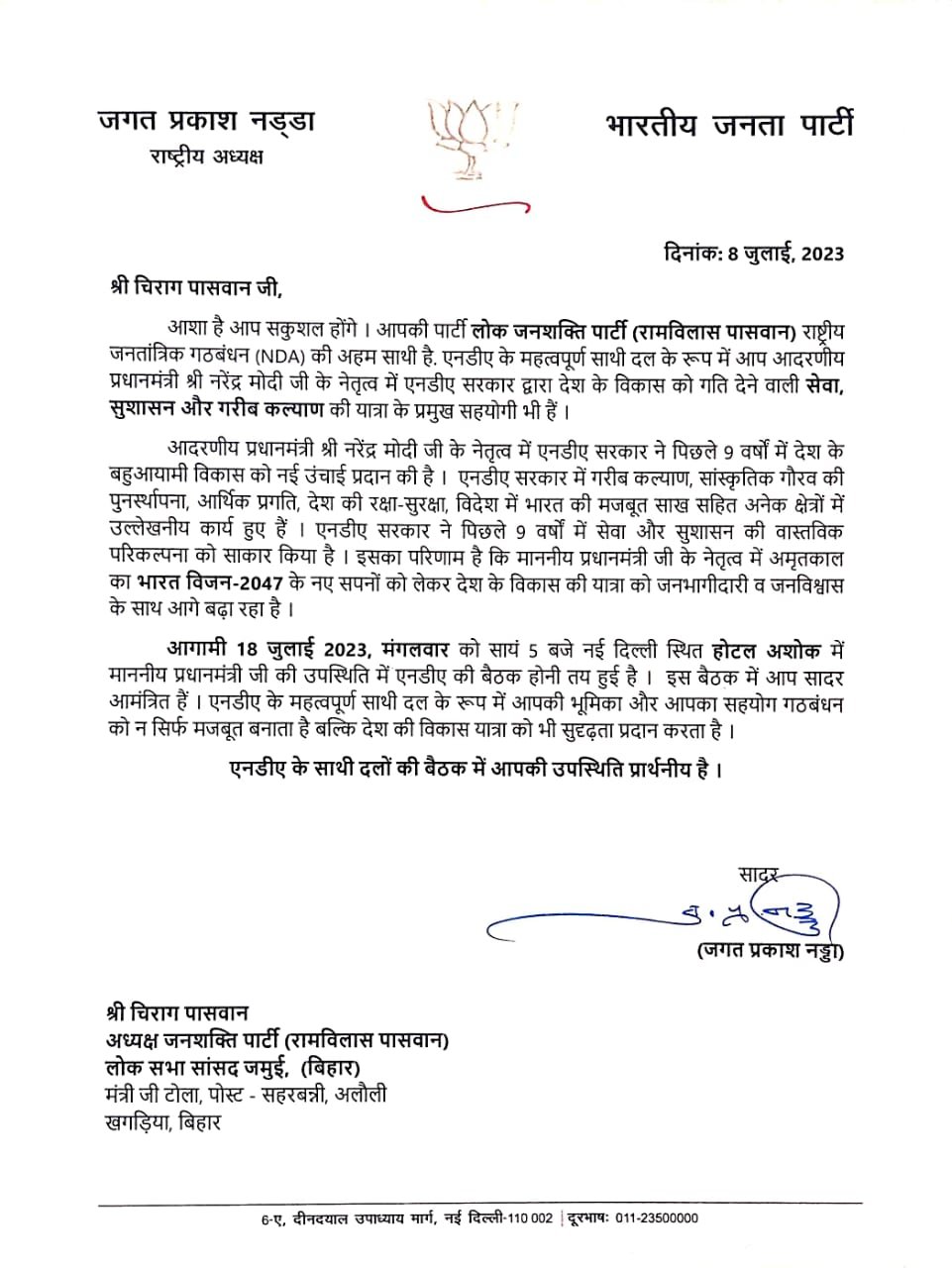 भाजपा और लोक जनशक्ति पार्टी (रामविलास) के गठबंधन की अटकलों के बीच भारतीय जनता पार्टी के राष्ट्रीय अध्यक्ष जेपी नड्डा ने लोक जनशक्ति पार्टी (रामविलास) के राष्ट्रीय अध्यक्ष चिराग पासवान को पत्र लिखकर 18 जुलाई को दिल्ली में होने वाली एनडीए की बैठक में आमंत्रित किया है। पत्र में कहा गया है कि लोक जनशक्ति पार्टी (रामविलास) बीजेपी के नेतृत्व वाले राष्ट्रीय जनतांत्रिक गठबंधन (एनडीए) का एक महत्वपूर्ण हिस्सा है।