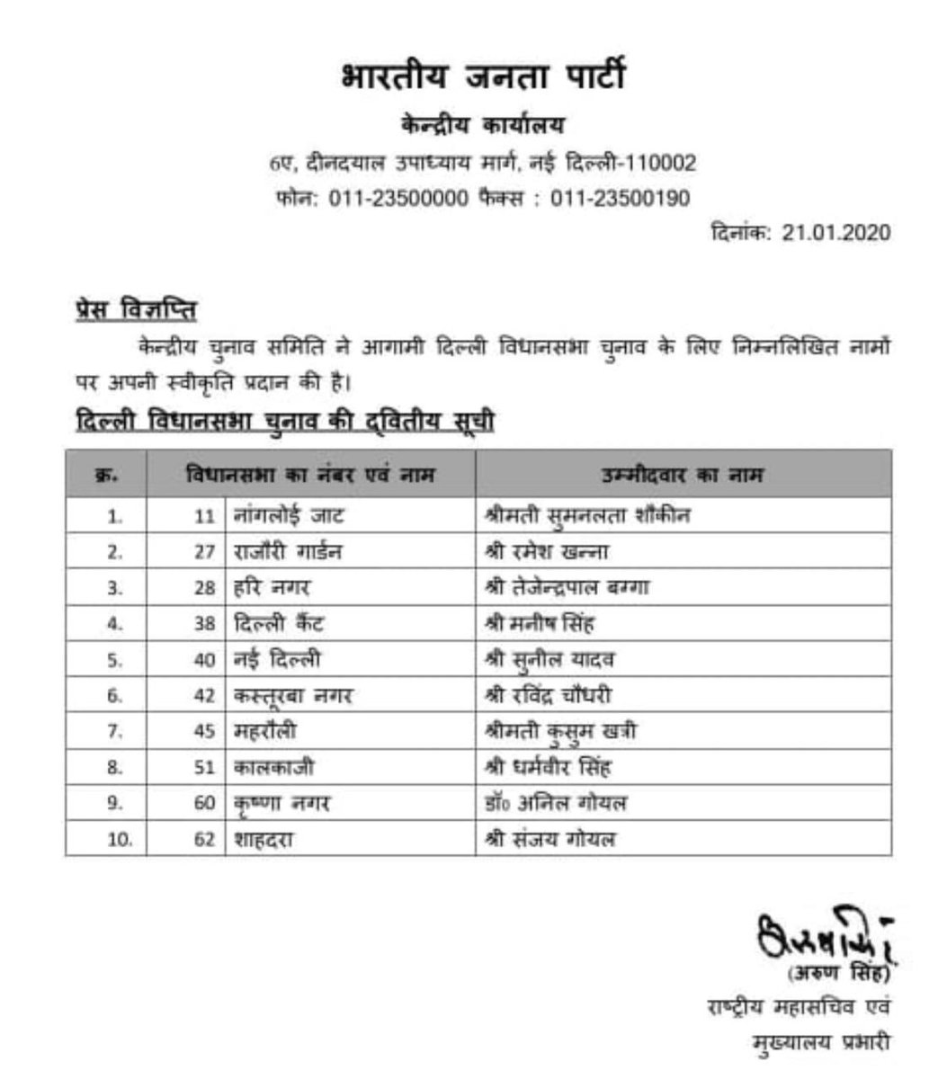 भाजपा ने मंगलवार को अपनी दूसरी सूची जारी करते हुए नांगलोई जाट से सुमनलता शौकीन, राजौरी गार्डन से रमेश खन्ना, हरि नगर से तेजिंदर पाल बग्गा, दिल्ली कैंट से मनीष सिंह, नई दिल्ली से सुनील यादव, कस्तूरबा नगर से रविंद्र चौधरी, महरौली से कुसुम खत्री, कालकाजी से धर्मवीर सिंह, कृष्णा नगर से अनिल गोयल और शाहदरा से संजय गोयल को प्रत्याशी बनाया है।