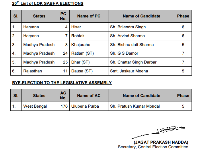 भाजपा ने अपनी 20वीं सूची में 6 लोकसभा प्रत्याशियों के नामों का ऐलान किया है, वहीं पश्चिम बंगाल में विधानसभा उपचुनाव के लिए एक उम्मीदवार के नाम की घोषणा की है। भारतीय जनता पार्टी की 20वीं उम्मीदवारों की सूची में हरियाणा के हिसार से बृजेंद्र सिंह को टिकट दिया गया है। बृजेंद्र सिंह केंद्रीय इस्पात मंत्री बीरेंद्र सिंह के बेटे हैं, जिन्होंने आज ही अपने इस्तीफे का ऐलान किया है।