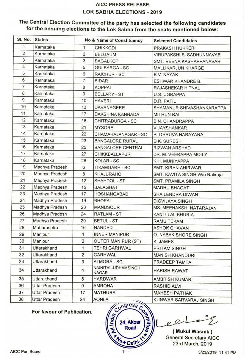 पार्टी महासचिव मुकुल वासनिक की ओर से जारी सूची के मुताबिक पार्टी ने वरिष्ठ नेता दिग्विजय सिंह को भोपाल से उम्मीदवार बनाया है। उत्तराखंड के पूर्व मुख्यमंत्री हरीश रावत को राज्य की नैनीताल-उधमसिंह नगर सीट से टिकट दिया गया है। इसके अलावा महाराष्ट्र के पूर्व मुख्यमंत्री अशोक चव्हाण एक बार फिर से नांदेड़ से चुनाव लड़ेंगे। पूर्व मुख्यमंत्री और पूर्व केंद्रीय मंत्री वीरप्पा मोइली को कर्नाटक की चिकबल्लापुर लोकसभा क्षेत्र से टिकट दिया गया है।