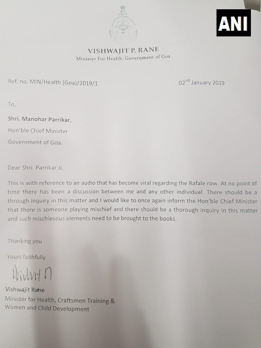 गोवा के मंत्री विश्वजीत पी राणे ने राफेल पर कांग्रेस द्वारा जारी किए गए ऑडियो टेप के संबंध में गोवा के सीएम मनोहर पर्रिकर को पत्र लिखा। उन्होंने कहा, ‘यह छेड़छाड़ किया हुआ ऑडियो है और मैंने कभी भी इस बारे में किसी से बात नहीं की। इसकी गहन जांच होनी चाहिए। इससे पहले गोवा के मंत्री ने अमित शाह को भी इस संबंध में पत्र लिखा।