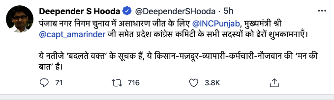 वहीं, कांग्रेस नेता और हरियाणा से सांसद दीपेंद्र सिंह हुड्डा ने कांग्रेस की जीत पर बधाई देते हुए लिखा, "पंजाब नगर निगम चुनाव में असाधारण जीत के लिए पंजाब के कांग्रेस कार्यकर्ताओं, राज्य की जनता और मुख्यमंत्री कैप्टन अमरिंदर सिंह समेत प्रदेश कांग्रेस कमिटी के सभी सदस्यों को ढेरों शुभकामनाएँ। ये नतीजे ‘बदलते वक्त’ के सूचक हैं, ये किसान-मज़दूर-व्यापारी-कर्मचारी-नौजवान की ‘मन की बात’ है।"