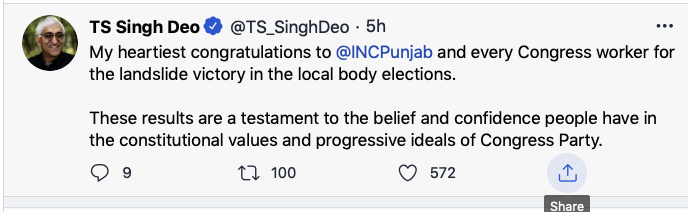 वहीं, छत्तीसगढ़ सरकार में मंत्री टीएस सिंह देव ने भी कांग्रेस को बधाई दी। ट्वीटर के जरिए उन्होंने लिखा, "मेरी हार्दिक बधाई @INCPunjab और स्थानीय निकाय चुनावों में शानदार जीत के लिए हर कांग्रेस कार्यकर्ता को। ये परिणाम कांग्रेस पार्टी के संवैधानिक मूल्यों और प्रगतिशील आदर्शों में लोगों के विश्वास का टेस्टामेंट हैं।"