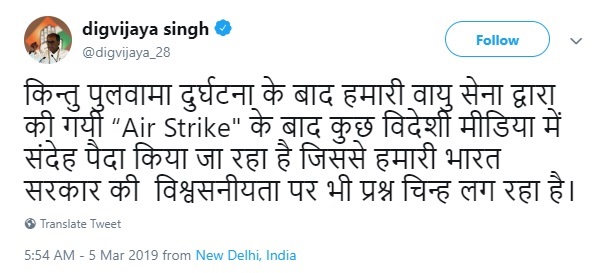 मध्य प्रदेश के पूर्व मुख्यमंत्री दिग्विजय सिंह ने ट्वीट कर कहा, “पुलवामा दुर्घटना के बाद हमारी वायु सेना द्वारा की गयी “एयर स्ट्राइक" के बाद कुछ विदेशी मीडिया में संदेह पैदा किया जा रहा है जिससे हमारी भारत सरकार की विश्वसनीयता पर भी प्रश्न चिन्ह लग रहा है।”