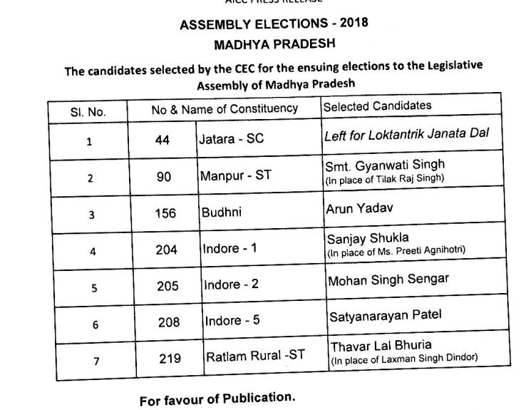 गौरतलब है कि गुरुवार को कांग्रेस ने उम्मीदवारों की पांचवीं सूची जारी की थी जिसमें 16 नाम शामिल थे। इस सूची में भाजपा से बगावत करने वाले सरताज सिंह को होशंगाबाद से टिकट दिया गया है। सरताज सिंह विधानसभा अध्यक्ष सीताशरण शर्मा के खिलाफ मैदान में होंगे। कांग्रेस ने एक और सीट देवसर से अपना प्रत्याशी बदला है। देवसर से अब रामभजन की जगह वंशमणि वर्मा को टिकट दिया गया है।