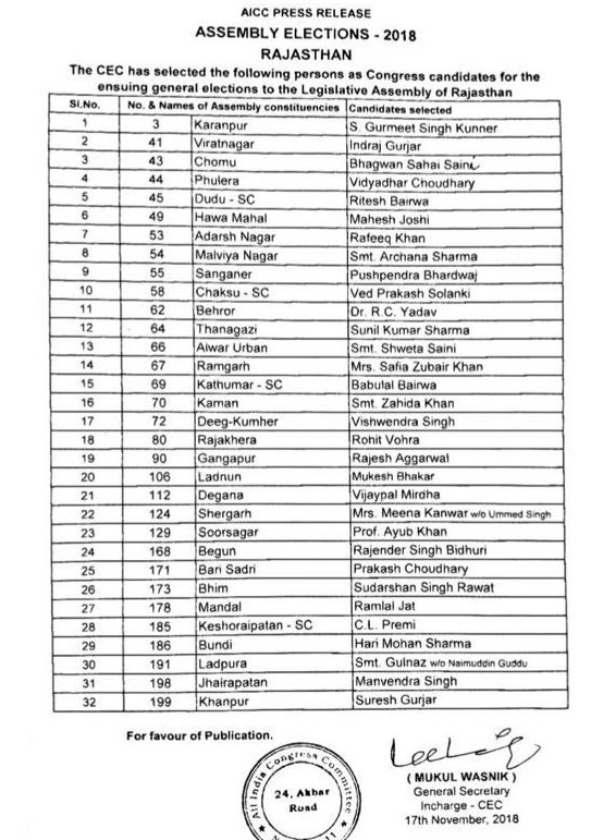 इससे पहले कांग्रेस ने खासी मशक्कत के बाद उम्मीदवारों की पहली लिस्ट जारी की थी। इस लिस्ट में कुल 152 उम्मीदवारों को टिकट दिया गया। इसमें तमाम दिग्गज कांग्रेसी नेताओं के नाम शामिल हैं। राजस्थान विपक्ष के नेता सचिन पायलट टोंक से और पूर्व मुख्यमंत्री अशोक गहलोत को सरदारपुरा सीट से उम्मीदवार बनाया गया है।