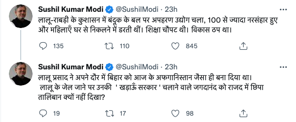 सुशील कुमार मोदी ने मंगलवार की रात को ट्विट कर लालू परिवार पर एक-एक कर कई हमले बोले। सुशील कुमार ने लिखा, "लालू प्रसाद ने अपने दौर में बिहार को आज के अफगानिस्तान जैसा ही बना दिया था। लालू के जेल जाने पर उनकी ' खड़ाऊँ सरकार ' चलाने वाले जगदानंद को राजद में छिपा तालिबान क्यों नहीं दिखा?"