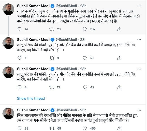 तेजस्वी यादव पर निशाना साधते हुए सुशील मोदी ने कहा, "राजद के छोटे राजकुमार की इच्छा के मुताबिक काम करने और बड़े राजकुमार से लगातार अपमानित होने के दबाव में जगदानंद मानसिक संतुलन खो रहे हैं इसलिए वे हिंसा में विश्वास करने वाले बर्बर तालिबानियों की तुलना राष्ट्रीय स्वयंसेवक संघ से कर रहे हैं।"
