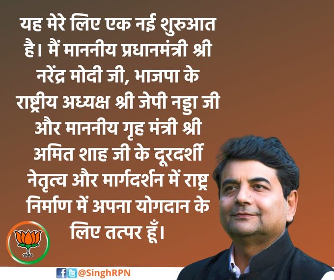 आरपीएन सिंह ने इससे पहले ट्वीट किया, ''यह मेरे लिए एक नई शुरुआत है, मैं माननीय प्रधानमंत्री नरेंद्र मोदी जी, भाजपा के राष्ट्रीय अध्यक्ष जेपी नड्डा जी और माननीय गृहमंत्री अमित शाह के दूरदर्शी नेतृत्व और मार्गदर्शन में राष्ट्र निर्माण में अपना योगदान के लिए तत्पर हूं।''