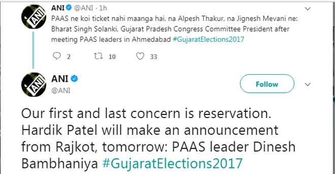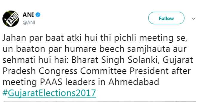 पास नेता और हार्दिक के सहयोगी दिनेश बामनिया ने भी बताया कि कांग्रेस ने उनकी मांगे मान ली हैं। उन्होंने कहा कि संवैधानिक दायरे में आरक्षण देने की हमारी मांग सबको स्वीकार है जिससे किसी के हित का नुकसान नहीं होगा। बताया जा रहा है कि पास के कई नेता कांग्रेस के टिकट पर चुनाव लड़ेंगे। सोलंकी ने बताया कि हार्दिक पटेल, ओबीसी नेता अल्पेश ठाकोर और दलित नेता जिग्नेश मेवाणी, तीनों में से किसी ने विधानसभा चुनावों में टिकट की मांग नहीं की है। हालांकि उन्होंने संकेत दिए कि इनके समर्थकों को पार्टी चुनाव मैदान में उतार सकती है।