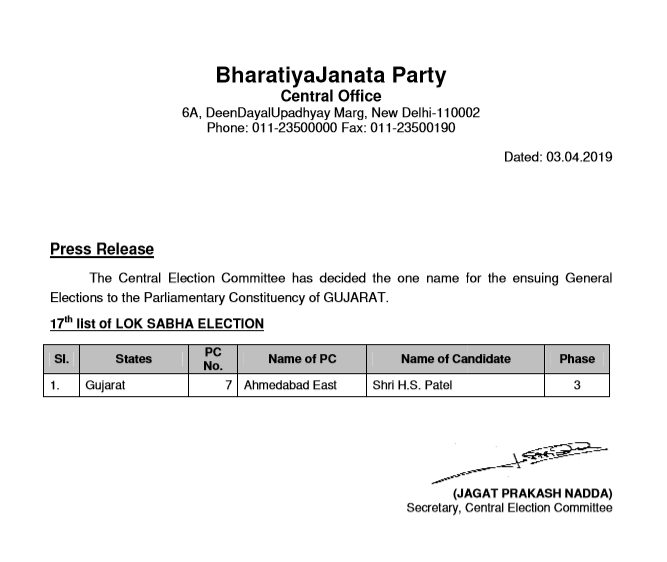 अहमदाबाद पूर्व से मौजूद सांसद परेश रावल ने खुद चुनाव नहीं लड़ने की बात कही थी। रावल ने पहले ही कहा था कि फिल्मों में व्यस्त होने की वजह से वह लोकसभा चुनाव नहीं लड़ना चाहते। जिसके बाद पार्टी ने उनकी बात भी मानते हुए इस सीट से हसमुख एस पटेल को चुनाव मैदान में उतारा है। रावल ने कहा था, 'मैंने पार्टी को चार-पांच महीने ही बता दिया था कि मैं चुनाव नहीं लड़ना चाहता, लेकिन आखिरी फैसला पार्टी का ही होगा।'