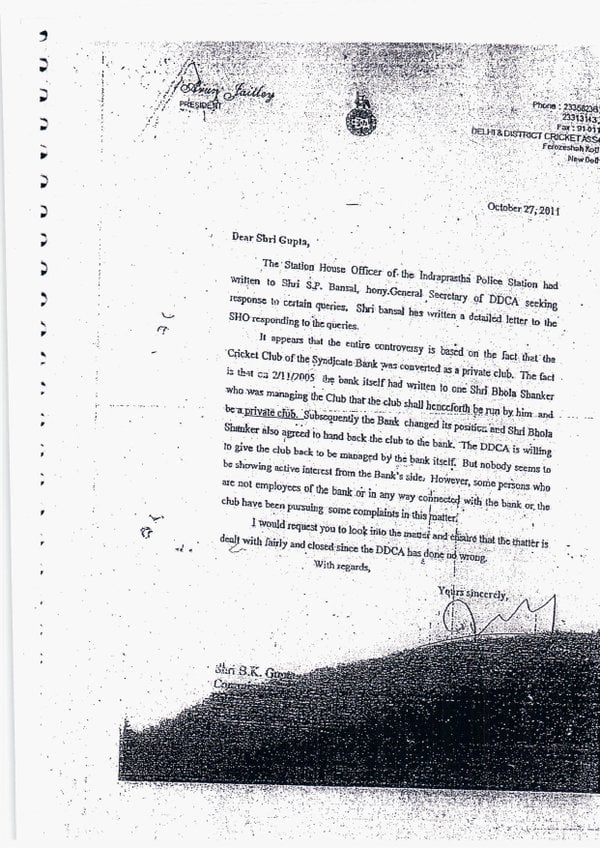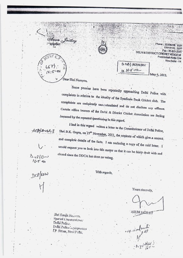 आम आदमी पार्टी ने आरोप लगाया कि वर्ष 2011 में बतौर डीडीसीए अध्यक्ष अरूण जेटली ने एक निजी बैंक के क्रिकेट क्लब की संलिप्तता वाले मामले की जांच को बंद करने के लिए तत्कालीन पुलिस आयुक्त पर दबाव डाला था। पार्टी ने दिल्ली के पूर्व पुलिस आयुक्त बीके गुप्ता और तत्कालीन विशेष आयुक्त रंजीत नारायण को कथित रूप से जेटली द्वारा लिखे दो पत्रों को जारी किया।