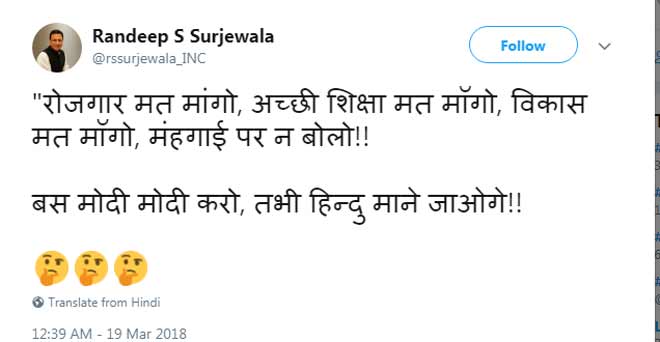 कांग्रेस पार्टी के संचार विभाग के प्रमुख रणदीप सुरजेवाला ने आज प्रधानमंत्री नरेंद्र मोदी पर जमकर वार किए हैं। उन्होंने कहा कि सरकार का ध्यान रोजगार, शिक्षा, विकास जैसे मुद्दों पर नहीं है। कांग्रेस नेता ने ट्वीट किया कि सरकार से रोजगार मत मांगो, शिक्षा मत मांगो, विकास मत मांगो और महंगाई पर न बोलो। सुरजेवाला ने कहाकि बस मोदी-मोदी करो तभी हिंदू माने जाओगे।
