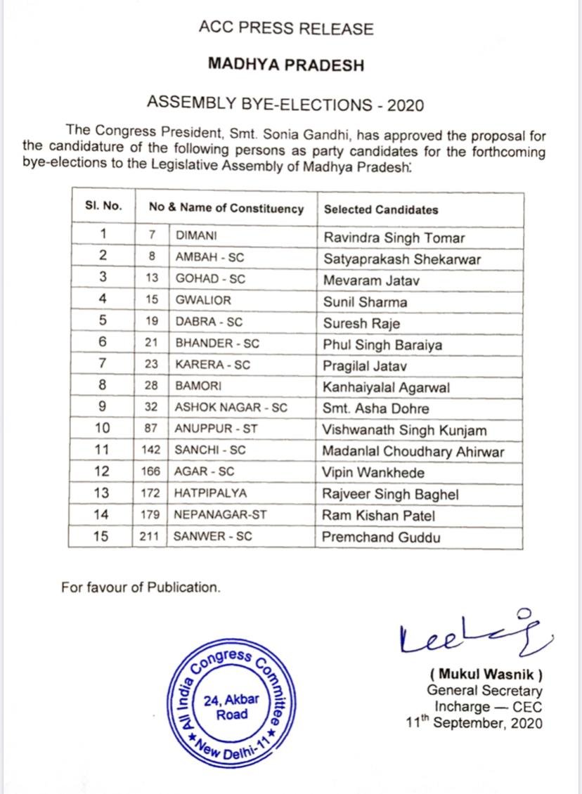 मध्यप्रदेश कांग्रेस ने विधानसभा उपचुनाव के कार्यक्रम के ऐलान के पहले ही 27 में से 15 विधानसभा क्षेत्रों के लिए अपने प्रत्याशियों की सूची जारी कर दी है। 15 अधिकृत प्उम्मीदवारों में से पार्टी ने उपचुनाव वाली सभी आरक्षित विधानसभा सीटों के प्रत्याशियों की घोषणा कर दी है।