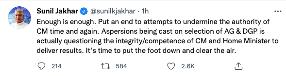वहीं, अब पार्टी के पूर्व प्रदेश अध्यक्ष सुनील जाखड़ ने कहा है कि अब बहुत हो गया है। सीएम की सत्ता को कमजोर करने की कोशिशों पर रोक लगाएं। उन्होंने सिद्धू की नाराजगी को लेकर भी ट्वीट के जरिए अपनी बातें कही है। जाखड़ ने कहा है कि एजी और डीजीपी के चयन पर लगाए जा रहे आरोप वास्तव में उनकी ईमानदारी/क्षमताओं पर सवाल उठा रहे हैं। यह कदम पीछे खींचने का समय है, जिससे हवा (सियासी रुख) को साफ किया जा सके।